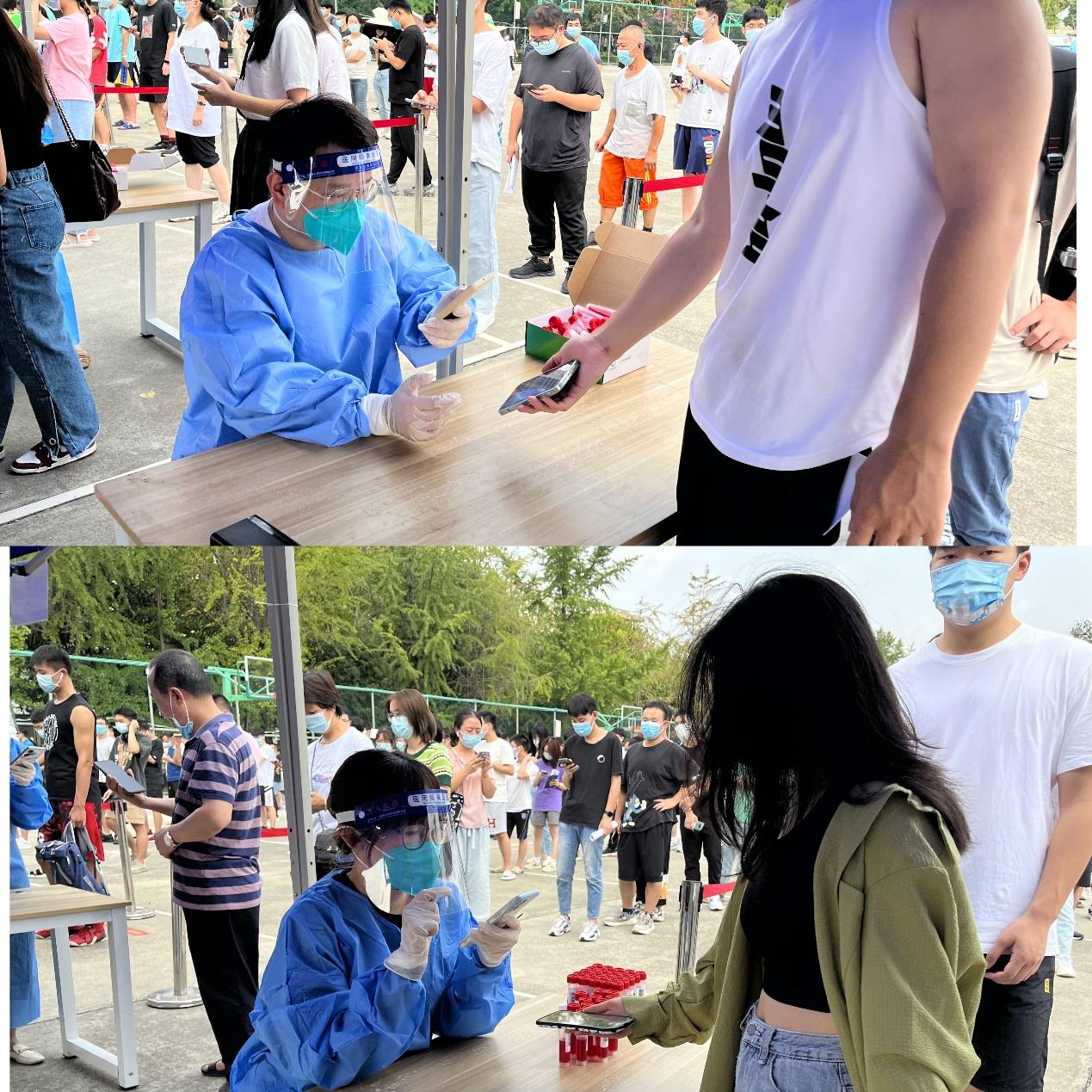 扫码、录入信息、协助医务工作者完成核酸检测,这是党支部党员陈建奇、尹玉萌同志在西南交通大学九里校区的抗疫日常。穿上防护服、打开手机便开始了一天的工作,冗长的核酸队伍,无法停歇的重复扫码,汗水浸湿了衣服,但是,一句“感谢”带来的心满意足和盼望疫情早日消散、重现烟火交大的信念让他们认认真真、毫无怨言。