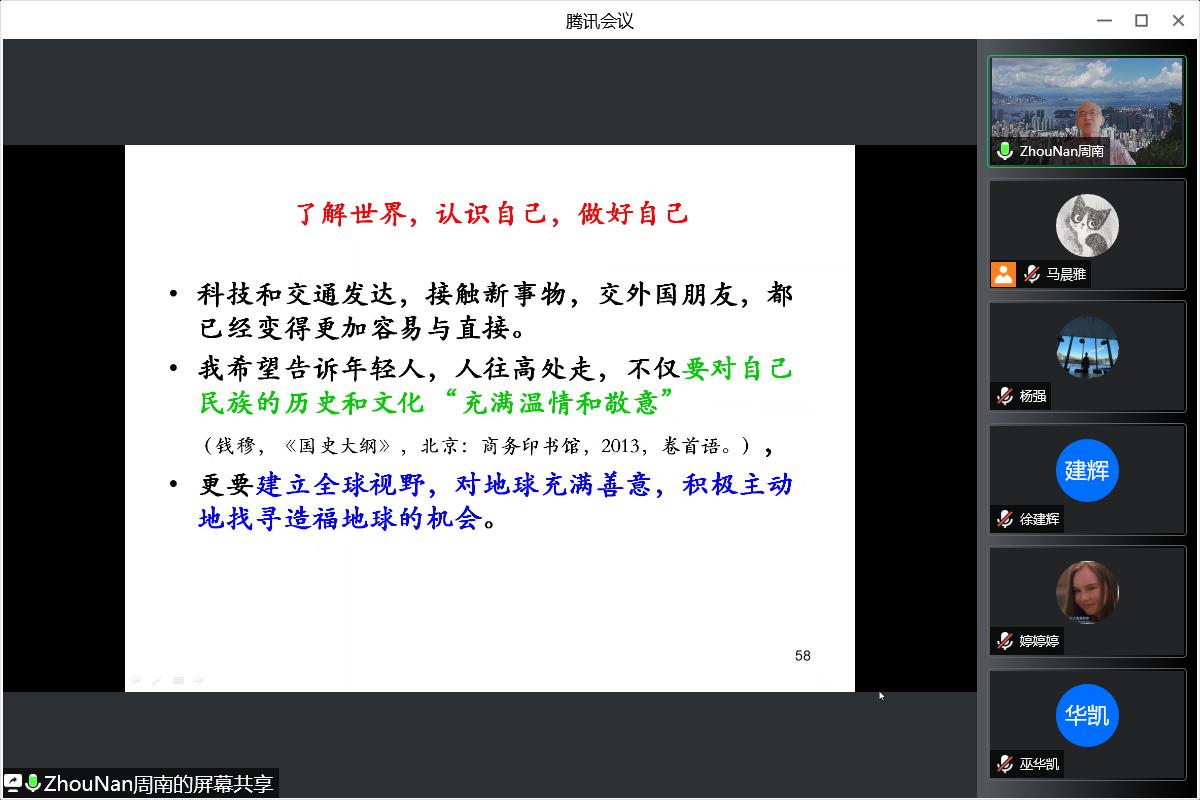 讲座尾声,周南教授引用钱穆先生《国史大纲》的卷首语“对自己的历史文化,须具温情与敬意”,对师生提出“建立全球视野,对地球充满善意,积极主动地找寻造福地球的机会”的期望,并详细解答了线上师生的问题。蒋玉石教授对周南教授的精彩分享致以诚挚的感谢,希望36365官网师生能够借此良机开阔学术思路、提高创新能力。
