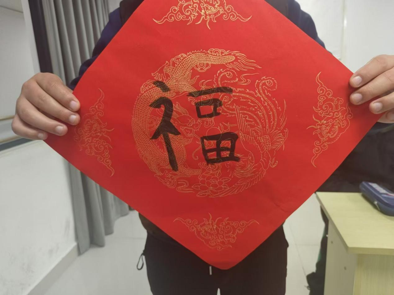 在职前班,志愿者们准备了空白对联和福字,开展书法教学。志愿者先在黑板上写下“福”“吉”“蛇”等字样,指导大朋友们在纸上模拟书写。待大家熟悉笔画后,志愿者为每人分发毛笔,手把手帮助他们书写,顺利完成作品。