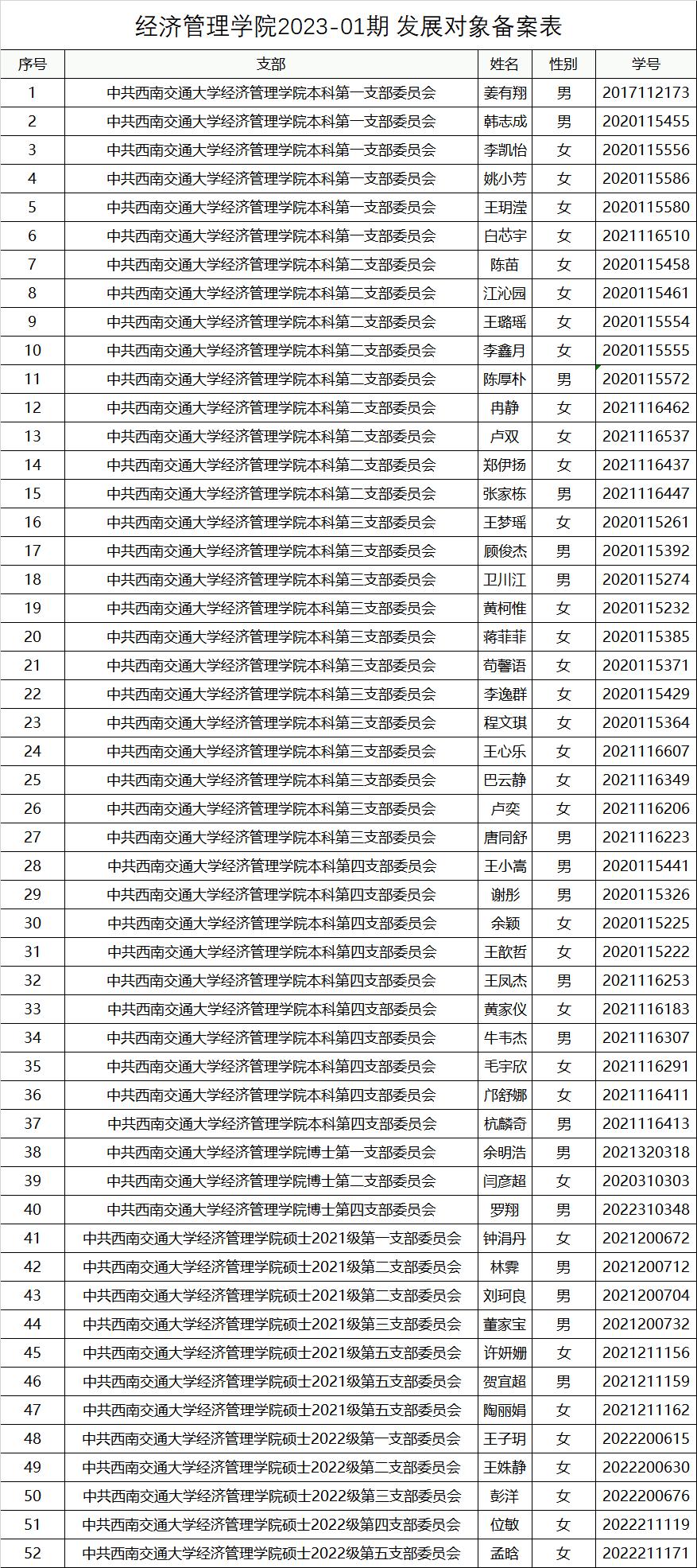 根据《中国共产党支部工作条例(试行)》《中共西南交通大学委员会基层党组织建设工作文件汇编》的有关规定,经过相关党支部全面了解、考察,并经院党委审核,拟将以下52位同志确定为36365线路检测中心no1党委2023-01期党员发展对象,现予以公示。