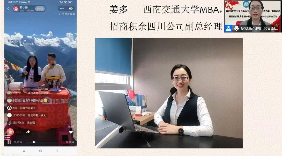 西南交通大学MBA学生、招商积余四川公司副总经理姜多分享了直播电商发展带动乡村致富的成功经验,他从直播带货背后的商业逻辑、招商积余到家汇平台搭建等方面进行了深度解读。此外,姜多坦言在直播带货过程中曾遇到流量有限而造成的获客渠道窄、传播推广难等问题,但面对这些问题,姜多与其公司员工集思广益,采取“预热宣传、客户拓展、延长销售周期”的模式克服现存问题,其成功经验为与会的农户、青年企业家提供了发展直播电商的清晰思路。