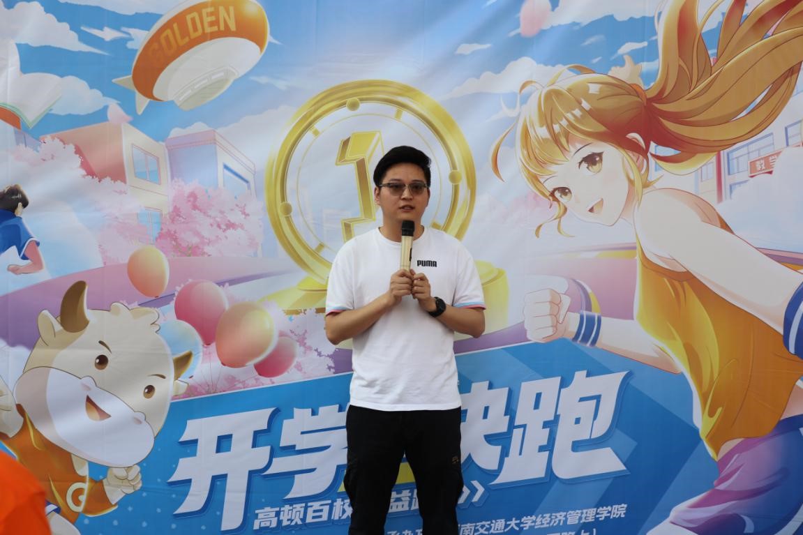 活动伊始,由高顿教育成都分校校长覃庆节致辞。他指出高顿校园公益跑旨在连接更多大学生,将大家的实际行动化为涓涓细流注入公益事业,为西部困难儿童捐赠爱心书籍,助力他们点亮梦想,覃校长也感谢了西南交通大学经管学院对本次活动的支持,希望同学们可以保持对运动的热情、提高对公益事业的支持。