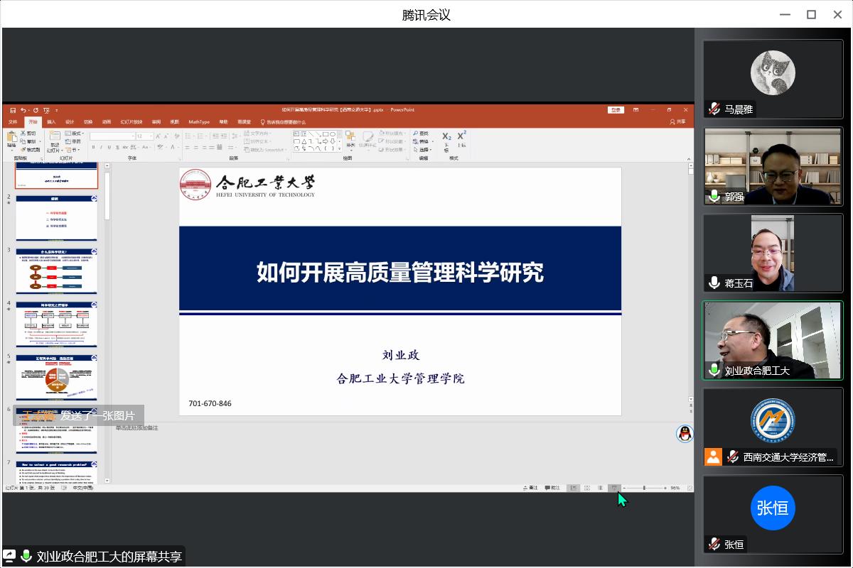 2022年12月10日上午10:00,合肥工业大学管理学院刘业政教授应邀为36365官网师生带来题为“如何开展高质量管理科学研究”的线上专题讲座。本次学术活动由市场学系蒋玉石教授主持,校内外师生60余人参加了本次讲座。
