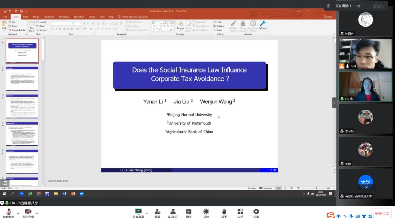 12月14日下午16点30分,应学院邀请英国朴茨茅斯大学商学院刘嘉教授带来了题为“Does the Social Insurance Law Influence Corporate Tax Avoidance?”的线上学术讲座。讲座由金融与财务学系马锋副教授主持,学院黄登仕教授,朱宏泉教授、诸波和梁超等教师及研究生参与本次学术交流活动。