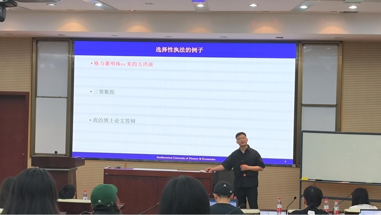 首先,诸波老师并向师生介绍了胡宁副教授的研究方向和学术成就。接着,胡宁副教授从证券交易所问询函监管的重要性出发,先是以北京深华新股份有限公司的年报问询函为例,介绍了问询函相关的基本概念。然后,胡宁副教授详细介绍了其专著《选择性监管及其经济后果研究——基于沪深交易所年报问询函的证据》中的主要内容,包括交易所问询函的制度背景、文献回顾以及研究内容。此外,他还分享了他在交易所问询函系列研究中的十一篇文章,涵盖了研究问题、作用机制及监管成效等多个方面。在此基础上,胡宁副教授进行了对问询函监管的深入思考,并提出了一些新的研究思路,旨在为后续相关的问询函研究提供启发和思考。