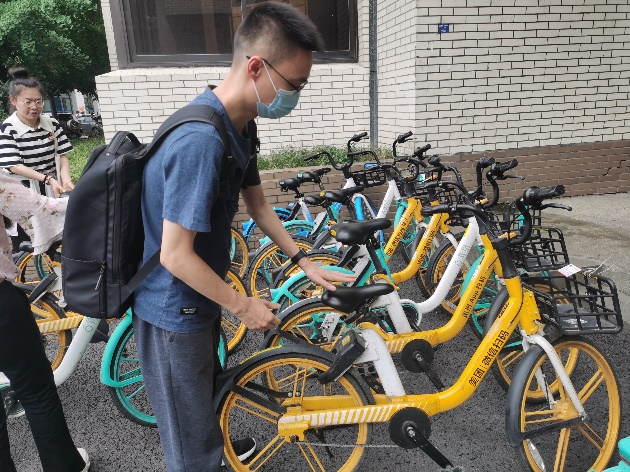正值上下课高峰期,支部成员在摆放整齐共享单车的同时,还积极引导前来上课的同学们有序停放共享单车,在支部成员的共同努力下,共享单车的放置井然有序。